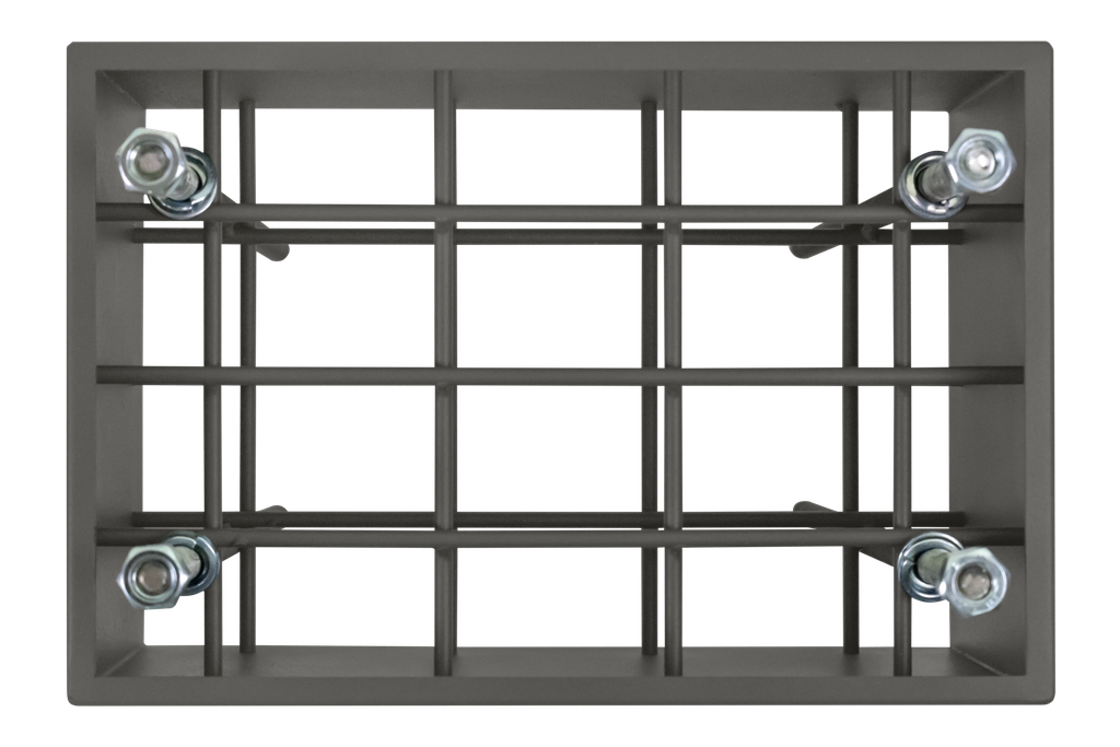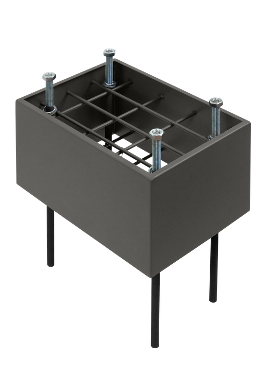 Опалубка для заливки фундамента под автоматические шлагбаумы серии «RBM» и «RBS». Изготовлена из стали толщиной 1,5 мм. Внутри конструкция усилена калибровочным кругом (прутком) d6 мм. 4 шпильки M12 для последующего монтажа механического шлагбаума. Опалубка окрашена в цвет RAL 7022